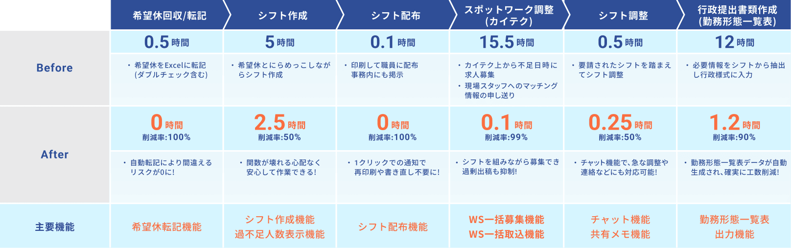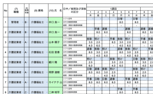 シフト表を作るだけで、行政の運営指導の際に必要な勤務形態一覧表用のデータを自動生成できます。