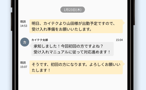 シフト変更の連絡、業務の引き継ぎ、急な欠勤の報告。事業所内のコミュニケーションがカイテクシフトの中で完結します。別途ビジネスチャットツールを契約する必要はありません。